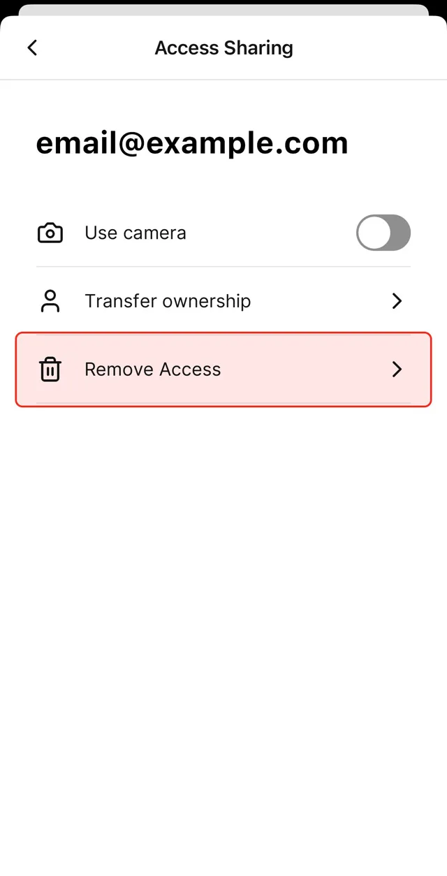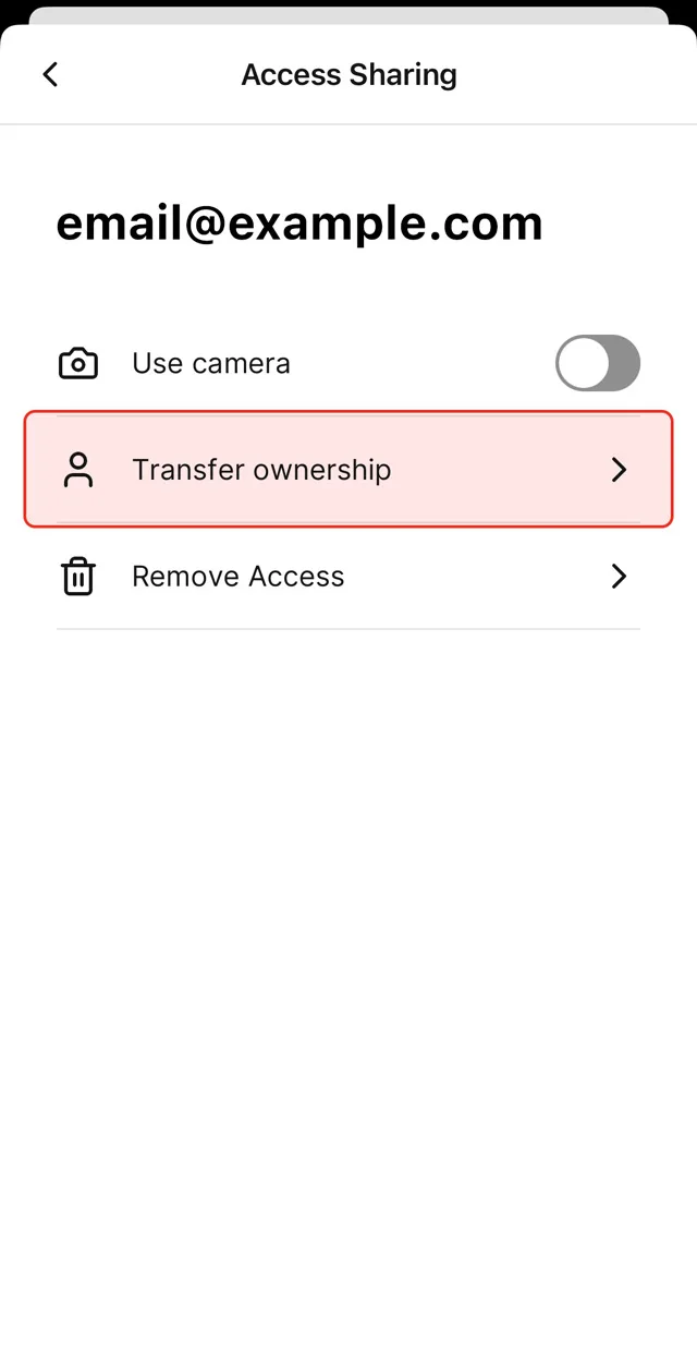 If you want to transfer ownership to another account, you need to share access to this account first. From the “Access Sharing” settings page, tap the menu button next to the shared account and select “Transfer Ownership”. This will make the chosen account the new owner of the device, and the original owner will become a shared user. The new owner has the option to remove access from the previous owner if desired.